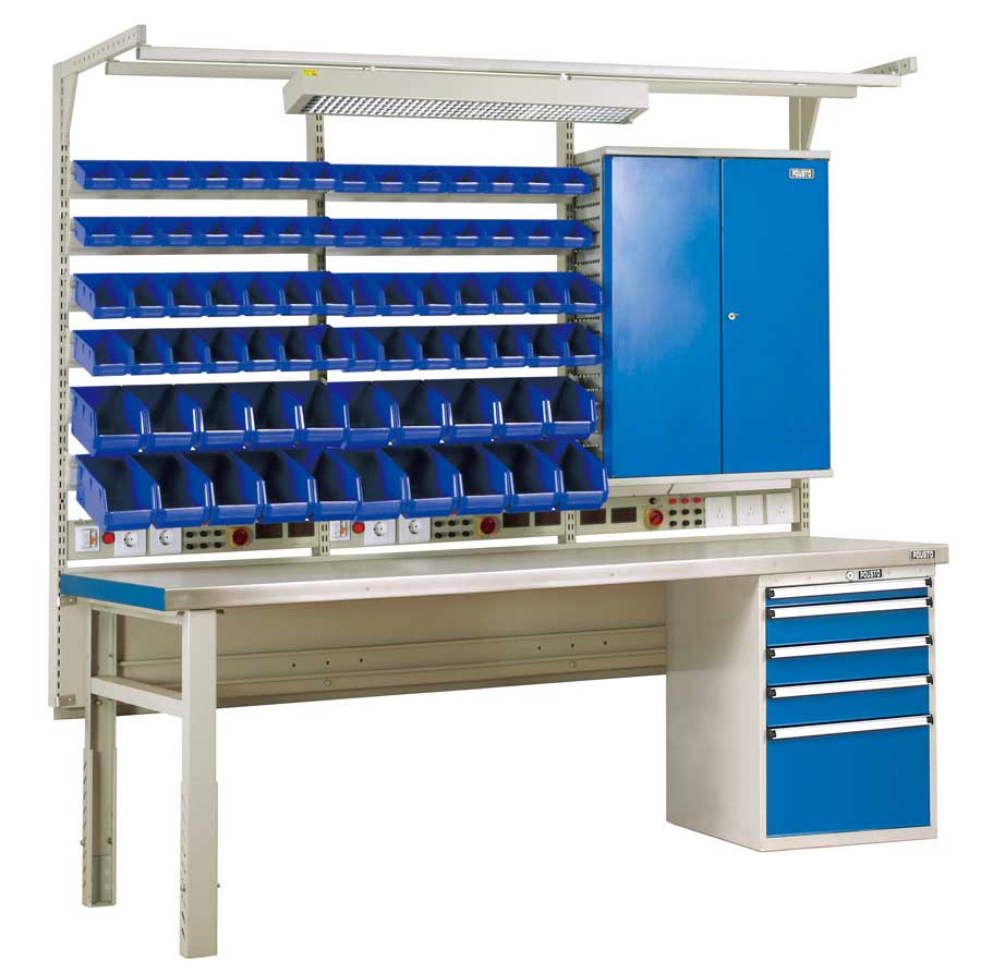 D725 single cabinet three span heavy duty workbench
